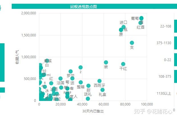 很惊讶吧,居然还能分析出词根的收藏量和月销量的情况,通过上面这个图,我们可以快速知道这些Top里头,实际上最受欢迎的就是葡萄、酒、红酒、进口、原瓶、支、干红、装等等这些词,把这些词组合成一句话就是,我们要往进口的葡萄酒这个方向去研究,干红,有几只装的那种最好卖。