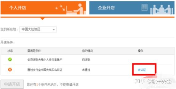 3、需要通过支付宝实名认证才能开店,点击去认证;