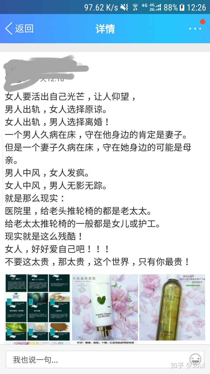 我做微商起早贪黑,不靠拉人头,完全靠零售做口碑,可是每当看到朋友圈有人沦陷,不想付出就想赚钱 为了钱完全无底线,我觉得喉咙里卡了两坨屎。又臭又硬的屎。