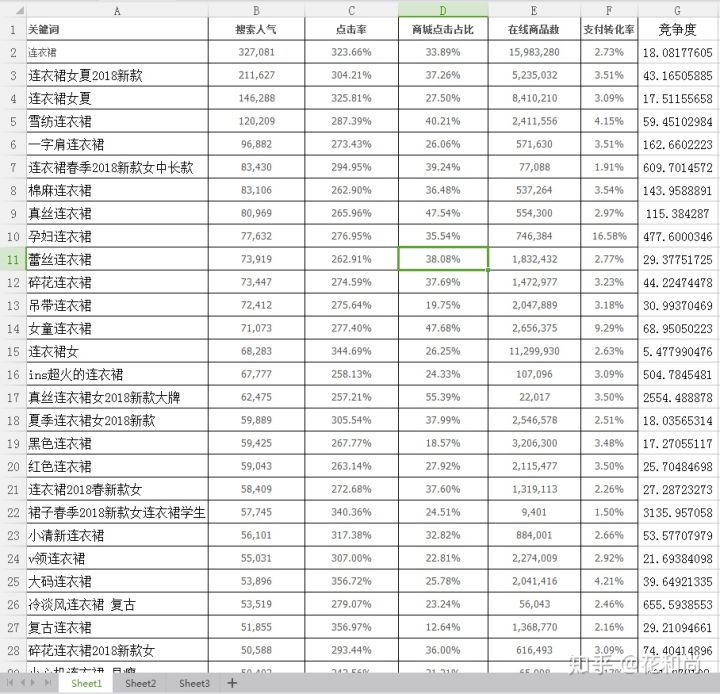 查看7天的数据,重点关注搜索人气,点击率,转化率,在线商品以及商城占比这5个数据。(如果没有生意参谋的朋友,可以找别人导一份词)