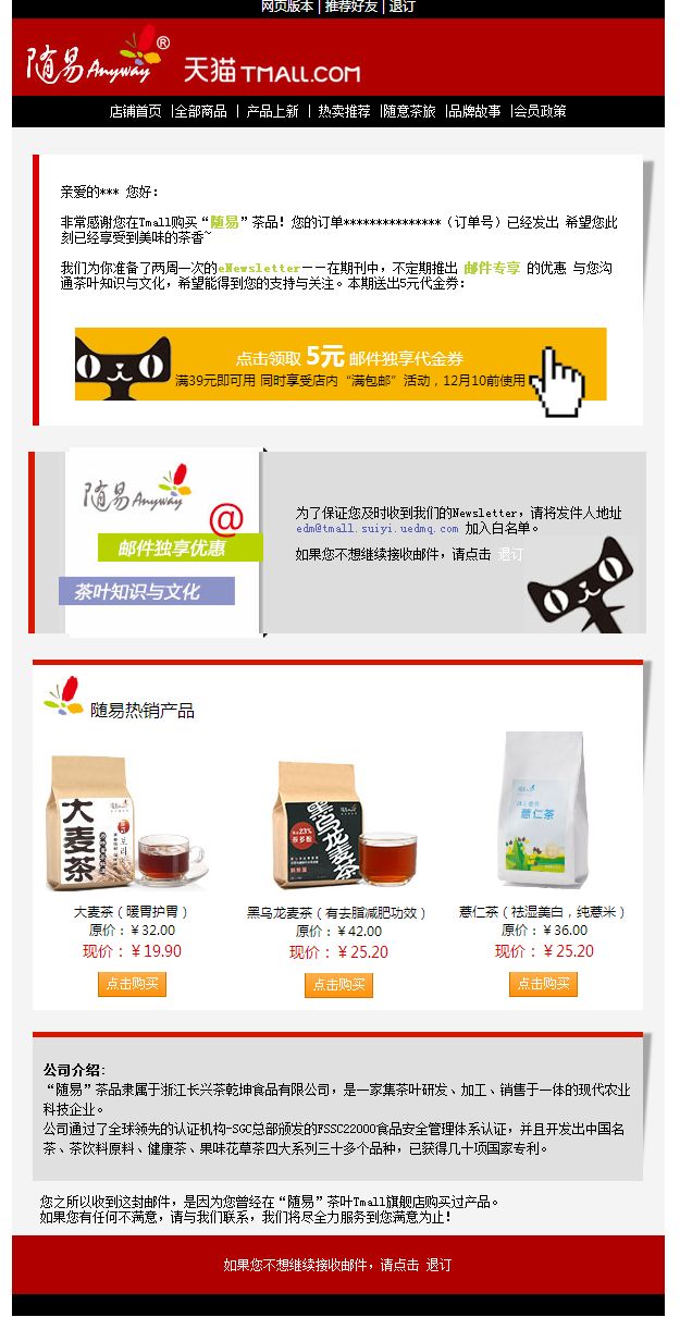 • Follow up邮件。Follow up邮件是最常被营销人员忽略的(什么是Follow up邮件?即用户在购物后的跟进邮件,可以是订单通知、发货通知、感谢购买等)。我曾经在实际操作中对比发现,发送过Follow up邮件的用户要比从未发送过Follow up邮件用户对后续营销邮件的打开率高10%左右!造成这么大区别的原因,个人认为Follow up邮件可强化淘宝店铺的品牌(Logo啊,CI等),让用户对你后续邮件产生信任与关注度;还有就是Follow up邮件中可赠送优惠券等,吸引用户再次购买的欲望。建议在用户购物后一周之内发送一封Follow up邮件,邮件主题与内容中可放置个性化信息,如用户的姓名、订单号、产品名称、优惠券等,同时还可提醒用户关注你后续的邮件,可以享受邮件独享优惠等。Balabala了一堆,给大家直观看一封我收到的淘宝店Follow up邮件。