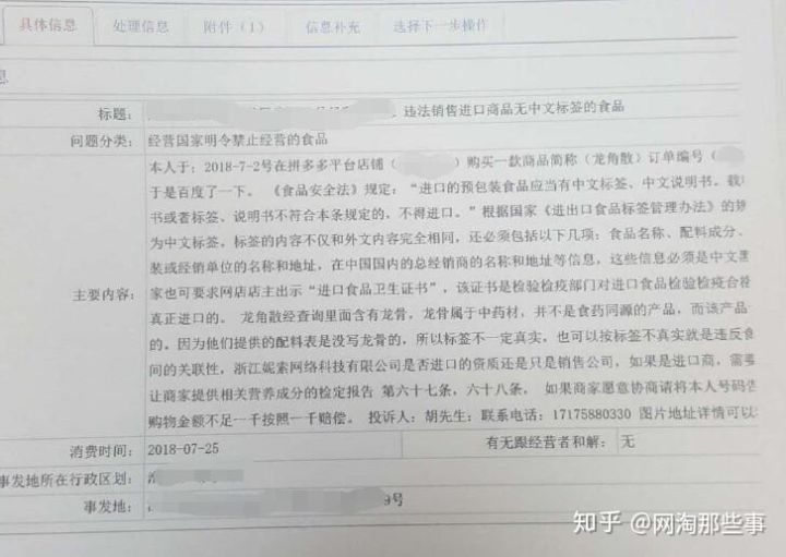 例如像上边的投诉,买家撕毁我们中文标签恶意投诉说我们没有中文标签,并且通过百度想当然的指出龙骨散中含有龙骨。因为龙骨是中药材,不得用于食品中添加,如果确实含有龙骨就是违法。工商联系我们后,我们给工商出示龙角散中不含龙骨成分的中文标贴就顺利的处理结案了。