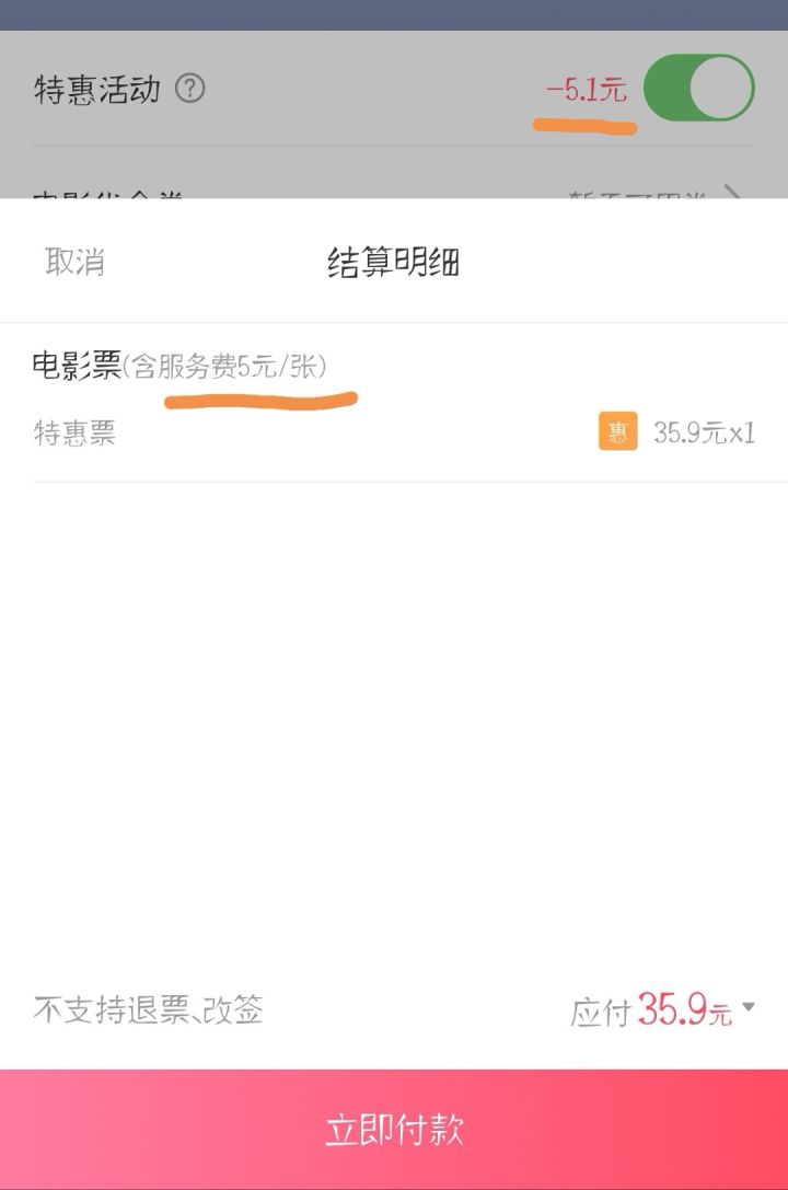 如图,用户实际付款金额35.9,但是第三方与影院结算价格应该是比这个价格要高的