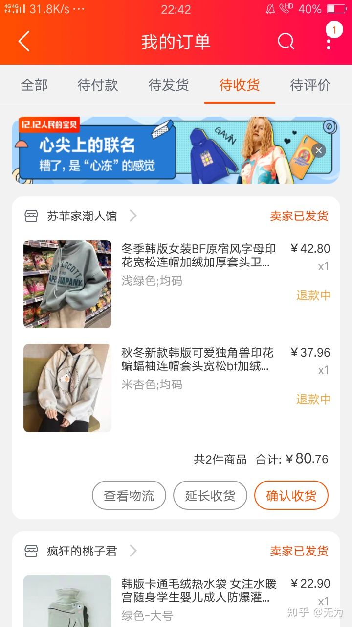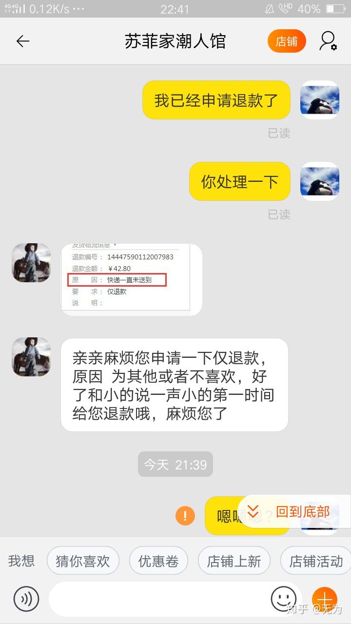 实名diss淘宝店铺苏菲家的潮人馆,因为夏天的时候在她家买了两件衣服,感觉还可以,然后前天我在她家下单了两件卫衣,快递揽收了一天,没有结果,然后我就去问可不可以我先退款,然后我再下单,但是不要帮我发天天快递,帮我发申通,卖家说可以,然后我申请了退款之后,再发信息过去,发现已经被拉黑,世贤疑问,这样子就拉黑,不明白她是怎么做生意的,气到爆!!!