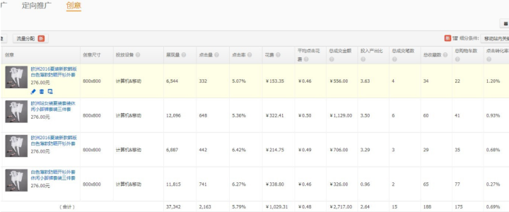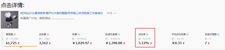 中期:宝贝的流量进来之后,就考虑到宝贝的点击率这方面了。大家都知道,只有宝贝的点击率上去了,关键词的质量得分才能上去了,同时ppc才能逐步下降的。这边结合宝贝的数据反馈,针对宝贝中点击率高的关键词进行优化;同时也通过对点击率高的关键词进行分析,对宝贝的创意标题进行修改,并对不同类型的图片进行测试,直到宝贝的点击率上升为止。