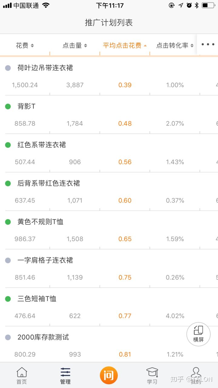 当然有的时候适当的进行提升或是降低花费也是一个可以提升roi的方法,一天的花费比较多的,花费上面是要控制好。现在整体ppc在0.85元。所以一般到下午或是晚上的时候就会提前下线,所以有的成交的词得不到很好的发挥。