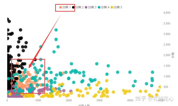 数据源当中,我使用了品质档、价格、付款人数、所在地,通过K-means算法进行聚类,最后得到5个不同的类别。这些类别的名字分别从1-5进行取名。