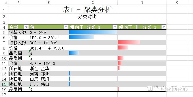 这个数据挖掘套件的好处在于,还能告诉我们不同类别的具体特征,比如从付款人数的平均值来看,分类1在117.07,分类2在64.22,分类3在152.17等等。这样子看数据是不是很方便了。