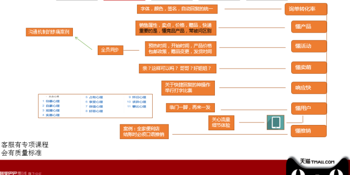 第五步:促效率 提高员工服务工作效率,降低劳动工作量和强度,全面提升实时性、时效性、响应度。提高效率、降低成本。效率的提高,除了制定各个岗位的职责说明书和工作流程手册之外,还需要应用各种专业软件,实现自动化办公,效率才能更高。一般淘宝店铺常用的软件工具包括:量子恒道,数据魔方,ERP(网店管家),CRM软件,旺旺机器人等等。专业的软件工具的使用,让效率能变成各种可以统计和考核的指标,会使运营更加精细化,营销更加精准化和数据化,业绩才会更加可控的快速上升。