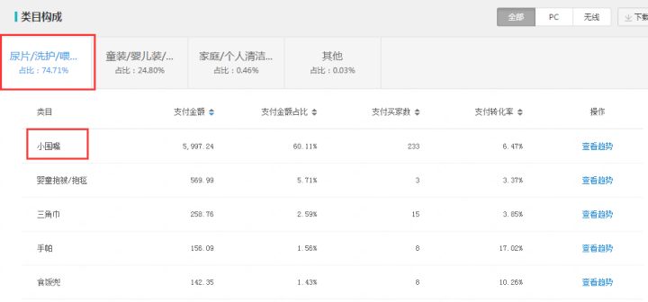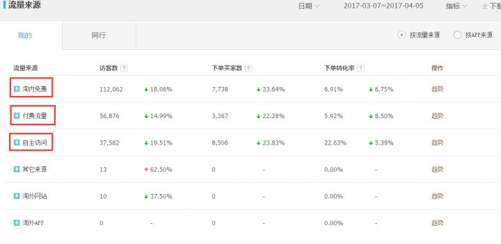 转化率也是一样,先看总店是下滑还是上升,再细分到每个宝贝,再去看端口。如果访客是正常的,看看行业有没有变化,行业是否有大促影响,或者同行是否有在低价抢转化等。