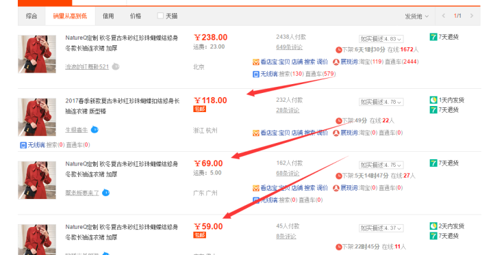 4、鸡头凤尾原则。宁为鸡头,不要为凤尾,当你搜索2015春装连衣裙,首页展示的48个宝贝,销量都是几百上千件,你又只排在第24名,但是搜索2015春装连衣裙女的时候,你排名却在首页第10位,那我的建议是,你做2015春装连衣裙女,只要你坚持把这个词语作为核心关键词去维护,那么不久你就会上前三。