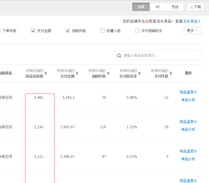 1、关注好店铺的流量结构是否正常,以及重点主推款的流量是否正常,如果数据跟前一天变化不大就没问题,如果流量出现明显的下降或是增长那就要去分析哪个渠道,哪个流量入口引起的这样的变化。