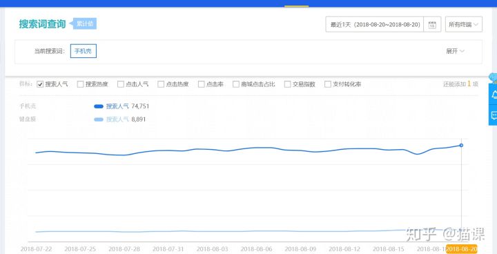 我刚从生意参谋上的市场数据看到(见下图),手机壳每日搜索人气是远远高于键盘膜的搜索人气,但是你如果一头扎进手机壳的类目,就会发现事情不是你想的那样简单咯。淘宝和线下生意的区别在于,淘宝面对的是全国的客户,实体店只能服务于它所在的那一片区域。所以啊,再小的行业在淘宝上都会有很大的需求。你如果选择做键盘膜,生意可能比手机壳还好呢,关键看我们如何定位和包装自己的产品。(这里只是举例子,并没有让你去做键盘膜哦,具体问题还需具体分析……)