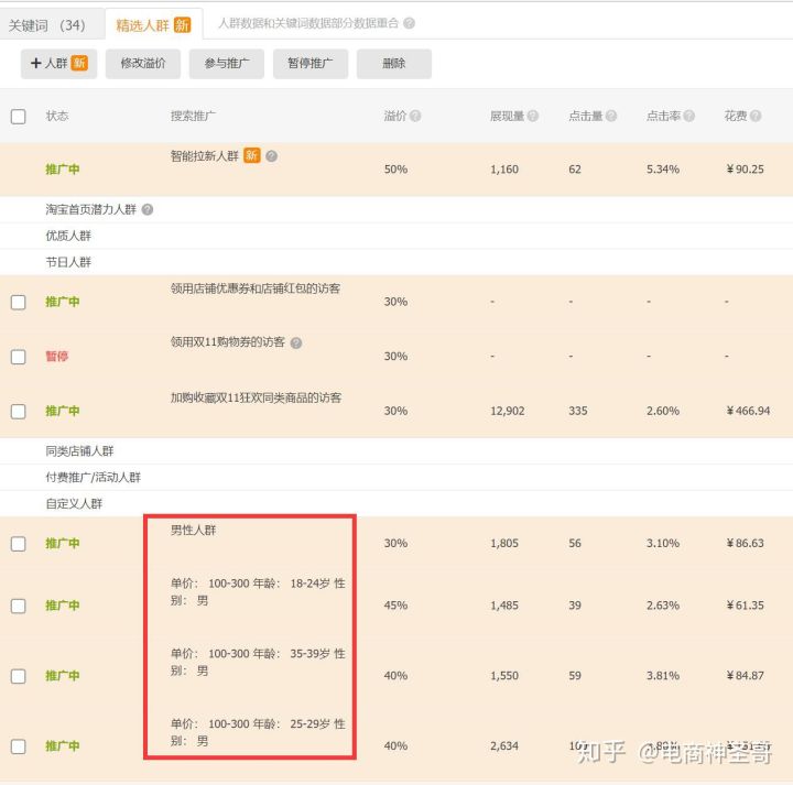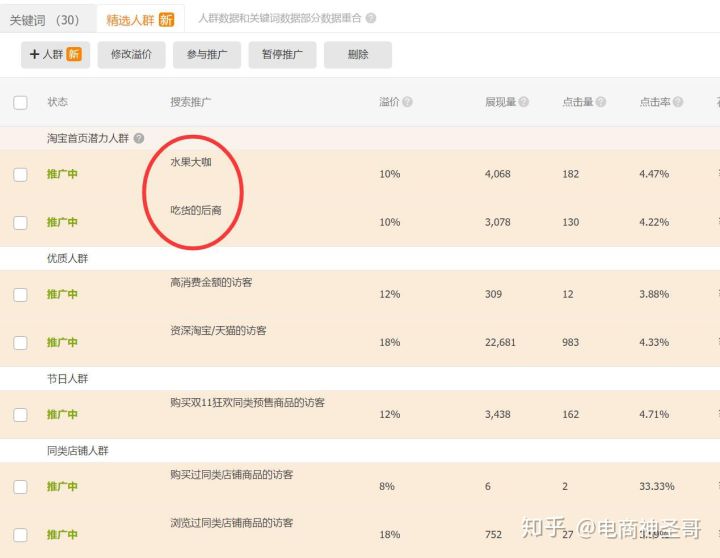 这里直通车应该怎么开呢?:可以用一个宝贝创建多个计划的方法,广泛匹配方式,尽量多点关键词(不过这个关键词需要和宝贝是有匹配相关度的,就算是很长的长尾关键词也不怕),然后再进行精选人群的关键词溢价,进一步提升流量的精准性和转化率,去弥补权重下降的点击率和转化的原因,这样能够保持权重的位置,不被搜索屏蔽且不被竞争对手占据。
