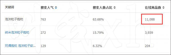 从生意参谋查询可以简单地得出,泡沫粒子抱枕这个关键词下的商品数有11088个,我们再直接搜索该关键词按销量排序,翻到11页就显示0人收货了,此页有9个0人收货,我们可以粗略地计算泡沫粒子抱枕这个关键词下,有44×11-9=475个有收货人数的产品,结合上面的商品数,我们可以粗略地计算出,475/11088*100%=4.3%,也就是说如果你是卖泡沫粒子的,你只需要一个销量,就可以直接干掉95.7%的同行竞争对手,至少在销量排序上占了绝对优势。