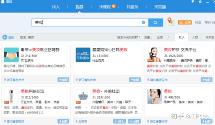 以QQ群为例,当你在群搜索“美肤”时,就会出现活跃度高人数多的群推荐。