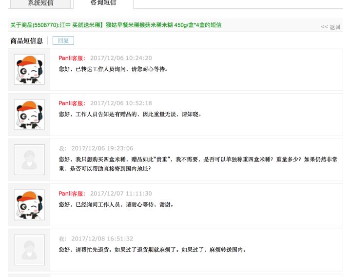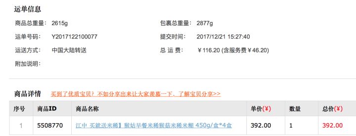 我猜,“应该是”店家送了一些赠品,所以特别重!这样的完全可以理解,彼时的我还不觉得Panli有什么不好,纯粹是因为太重了——如果5235克送过来,光运费就是460元了,米稀才390元——所以我选择转运国内,送给家人喝。