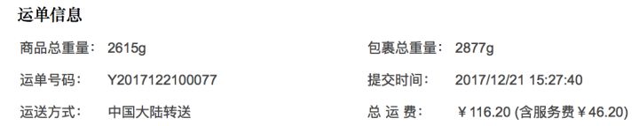 狗血的事情来了:我选转运国内以后,商品重量(而非包装重量)居然自己变化了!!!变为2615克!!!也就是2620克的重量自己跑掉了!!!