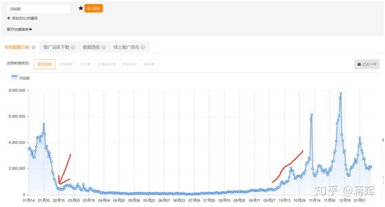 10月初的市场销量开始上升,到了2月中旬就开始逐渐下降了。所以羽绒服这款产品必须要提前2个月准备:选款(女装款式非常重要)、拍摄、测试、基础销量以及打爆。