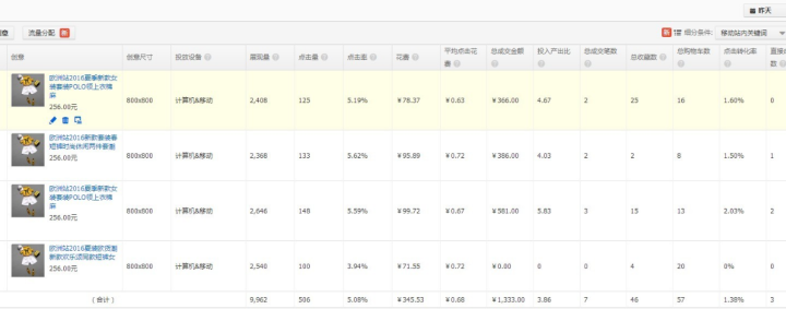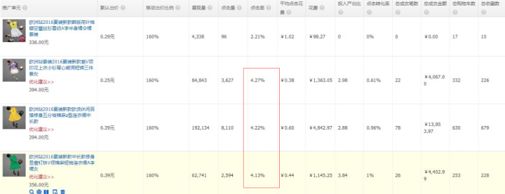 中期:宝贝的流量进来之后,就考虑到宝贝的点击率这方面了。大家都知道,只有宝贝的点击率上去了,关键词的质量得分才能上去了,同时ppc才能逐步下降的。这边结合宝贝的数据反馈,针对宝贝中点击率高的关键词进行优化;同时也通过对点击率高的关键词进行分析,对宝贝的创意标题进行修改,并对不同类型的图片进行测试,直到宝贝的点击率上升为止。