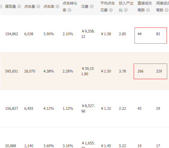 但是这里千万不要去看点击率转化率,我们这里把关注点放在直接成交笔数和间接成交笔数,可以看到,第一款直接成交笔数并不多。它并不能作为主推款去打,它转化率看起还可以是它的整体转化率看起还可以;但它的直接转化率低,它自己的销量就起不来;它销量如果起不来,它自然流量就进不来。