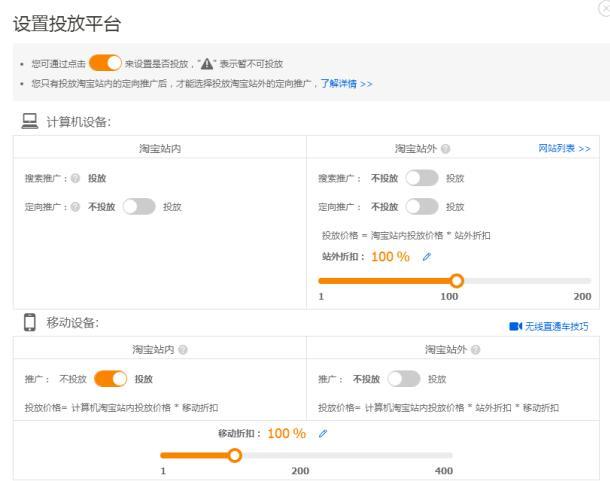 选择移动设备的淘宝站内投放,其他端口全部关闭掉,移动溢价100%,这里多说一句,很多朋友这里设置的很高,其实意义不大的,现在PC、移动都分开去做了正常设置就可以了。