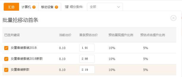 关键词的出价决定了宝贝的位置,现在有很多的优质的车位,PC端的首页的右侧车位和底端车位,无线端的首条位置,这些位置展现量是非常大的,如果你的推广图再给力一些,那你的点击率肯定低不了,当然不是说大家都要去争第一的位置,还是要量力而行的,在有效的投放之内,通过不断的测试找到更适合自己的位置去投放,争取把利益做到最大化。