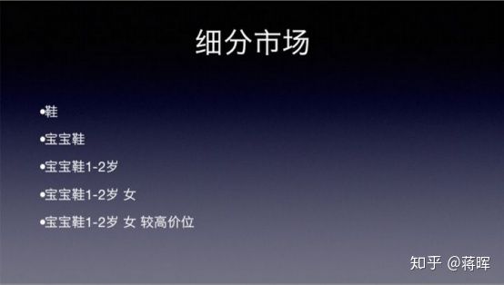 题主想要卖鞋,鞋这个市场本身非常的大,首先进行切分,有男鞋、女鞋、老人鞋、宝宝鞋等等。
