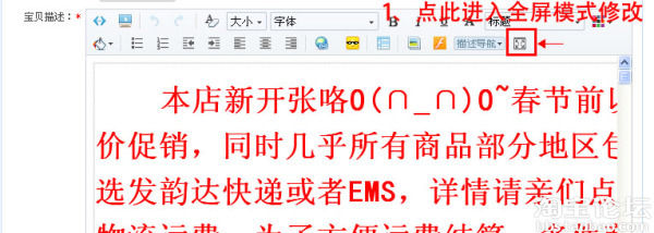 7. 1、进入宝贝编辑,编辑宝贝详情,点击右边全屏模式修改(全屏显示效果图明显)