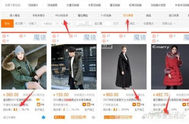 1688找货类似于淘宝,但又和淘宝不完全一样,找出爆款货源也是由很多因素决定的,以羽绒服为例,除了成交额和综合排序以外,发货时间,退换货,实力商家,回头率,以及厂家的资质等方面对于淘宝卖家都是非常重要的,毕竟你是要赚钱的,是要比一般买东西的淘宝买家要多费心思的。