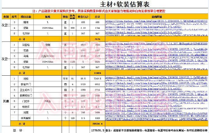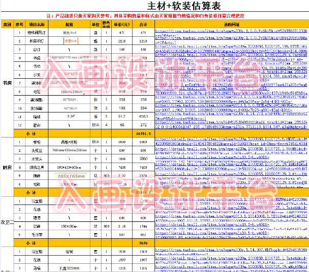 你可以要求独立设计师把你房间里面每一样材料(除了水泥河沙)的淘宝链接都给你,当然你也可选择在别的淘宝店铺或者京东买,只要尺寸风格一样就行。这样在材料这一块可以真正做到价格透明。