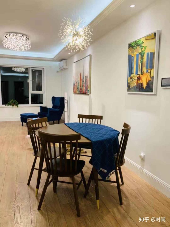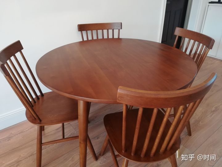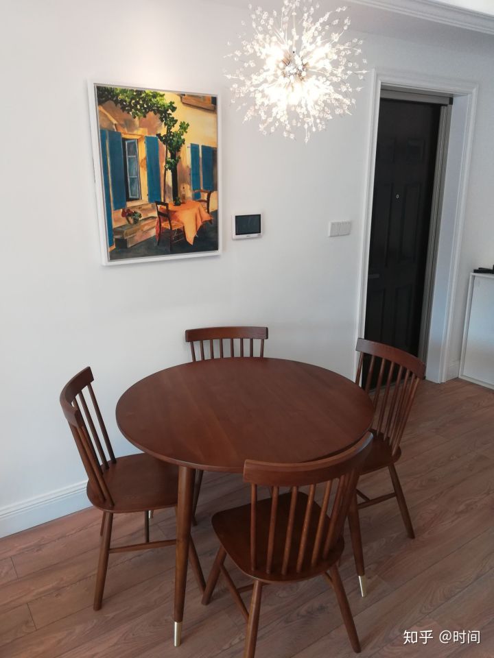 在搭配方面也和客厅的装修没有什么不协调的地方, 如果在缺的地方补一个三角型本身就是一个正方形, 同时有一条边30cm的边和客厅垂直, 另外一边和墙相连, 在客厅中看这张桌子, 也不会觉得不周正. 椅子我就用的下面推荐的宜家餐椅, 搭配上也没问题.