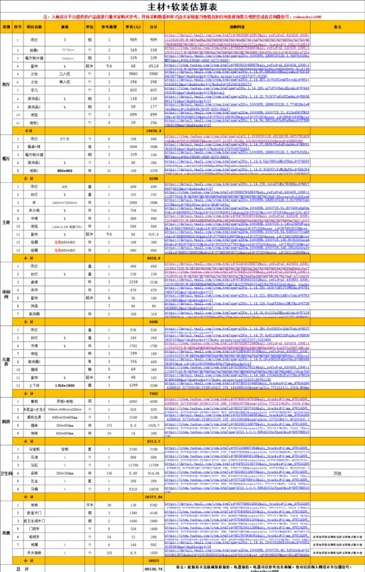 我们平台的设计都会给出所有的主材和软装的尺寸、数量、价格、参考淘宝链接、 参考价格