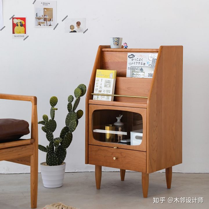 这款杂志柜上部可以放近期阅读的读物,拿取都非常方便。中间做了可翻转的门板,照样可以放书或者喜欢的工艺品,灰尘多时可以翻下面板防尘。下部是一个抽拉的抽屉,有记阅读笔记习惯的常用的纸笔备在抽屉里。这款杂志柜的机关在于上部杂志架背后有一个空间,靠墙的话可以将插线板等不美观的收纳其中。上部还留了留线孔。