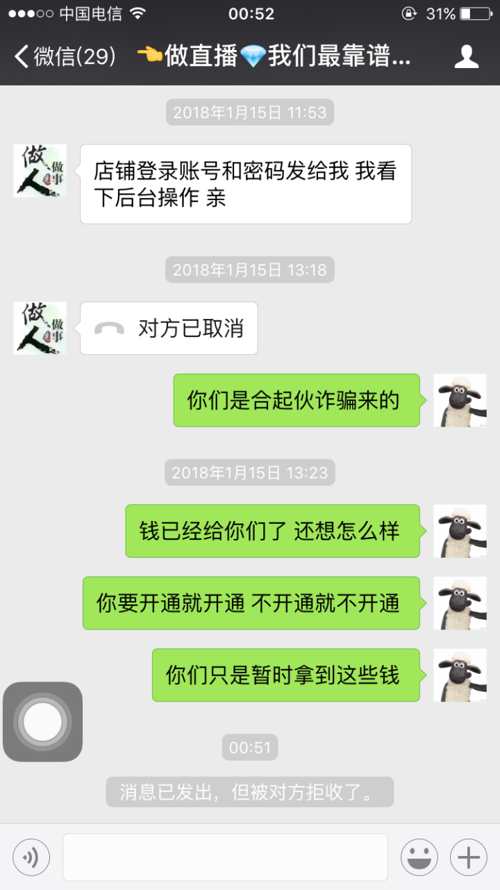 8. 我被淘宝直播代办骗了。几千块钱也是钱,小李直播,现在改名了,让打款到伟程商贸二店,钱给了各种理由开通不了!警醒大家!我花了4200,什么也没办!讲述我的经历,8月份百度搜到小李直播代办,淘宝直播,一直怕是骗子没有交钱!到九月底,我实在想开通,又找到他们,之前说1600加淘宝粉丝一万包开通,交钱以后又要收2600,跟那人大吵一架,但他说包给你开通,我是真心服我自己了,就这我也相信了!等录完视频了,说颜值底,可以以卖家开通,再加两万粉丝,3200,我没再给他!