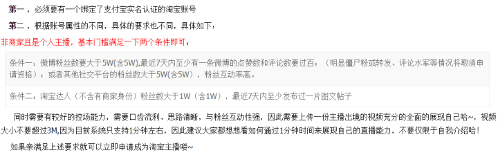 我作为一个从16年淘宝直播刚刚开始就从事这方面业务的人来说,我提供的信息应该比大多数人都要靠谱,毕竟也算是淘宝直播的“元老级”了。下面这张图是淘宝直播官方小二给出的要求