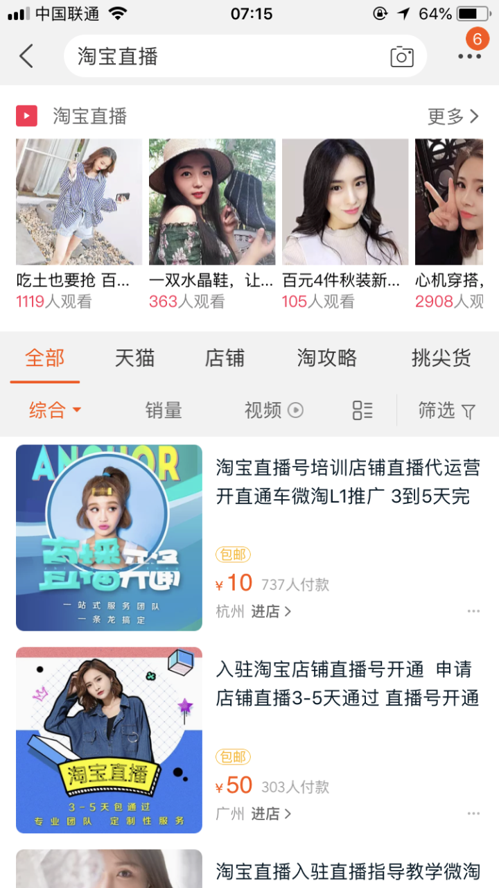 二,手淘搜索关键字:淘宝直播,返回结果的顶部可以进入淘宝直播频道。