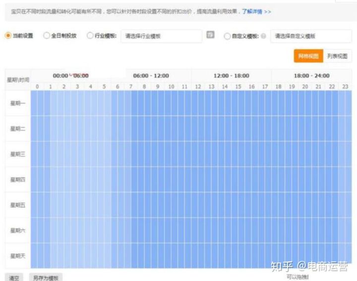 投放时间的设置因类目不一样而有所区别,最简单的方式是选择模板,也可以根据经验自己制作模板,后期根据点击情况进行调整。