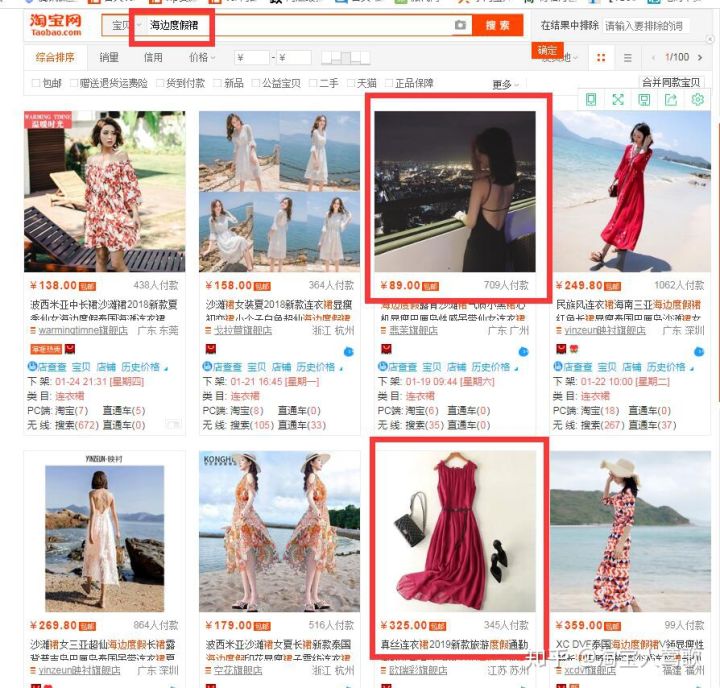 做场景图是为了让买家有很强的代入感,让买家有一种身临其境的感觉,如果你的竞争对手没有做,你做了,那么恭喜你,你赢的买家点击的几率就会更胜一筹。以下图为例,搜索“海边度假裙”这个关键词,你做为买家你会选择哪个呢,阳台上和平铺的那张图很明显不会是买家优先考虑的对象。