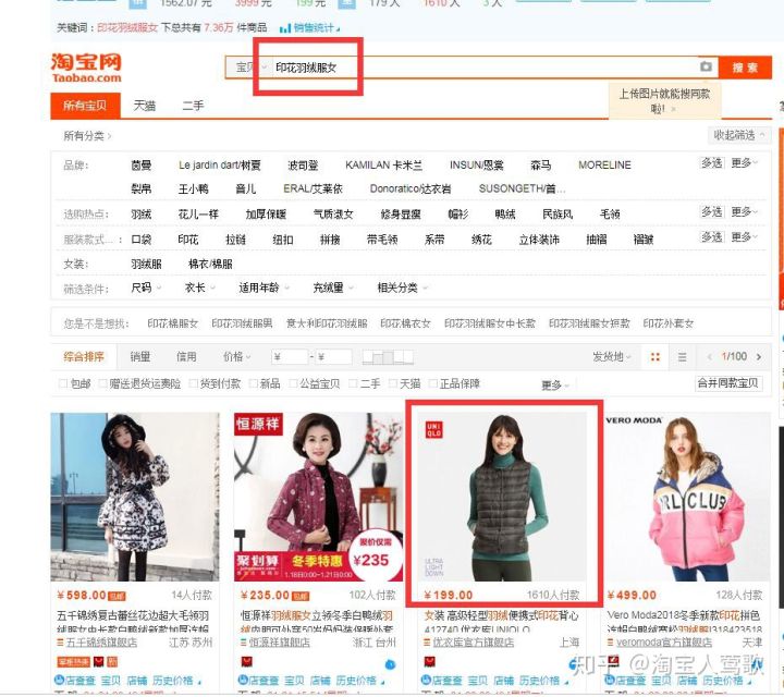 关键词与主图的相关性越强,点击率也会越高,夸张一点来说,比如女性买家搜索印花羽绒服,关键词下的宝贝有一件男款的,很明显,这不是她想要的,那么她也根本就不会点击,这样就形成了一个访客的流失。更细一点来分析,以下图为例,搜索“印花羽绒服女”结果可以看出,有一件根本就没有印花,所以买家她不会点。