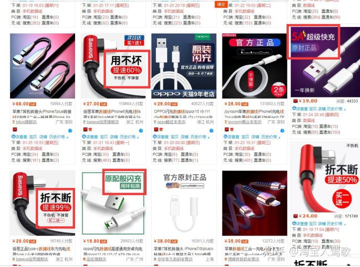 抓住买家贪小便宜的心理,或者是突出产品的卖点,刺激买家的点击欲望,如果大家不知道怎么去做卖点营销,可以搜索关键词,自己去浏览页面,看哪些是能吸引你去点击的,借鉴一下,结合你自己产品的实际卖点,就可以了。有时候没有灵感要去找,看别人怎么做。大家可以看一下数据线的卖点营销,同样是抓住的买家的痛点,充电慢,容易折断, 不伤机,这些是产品的卖点,买二送一,买一送一,拍下立减,是抓住了买家贪便宜的心理。做卖点营销的时候要去分析,买家担心的是什么,买家真正需要的是什么,再结合同行的一些案例,接下来你就明白自己的主图要怎么去做了