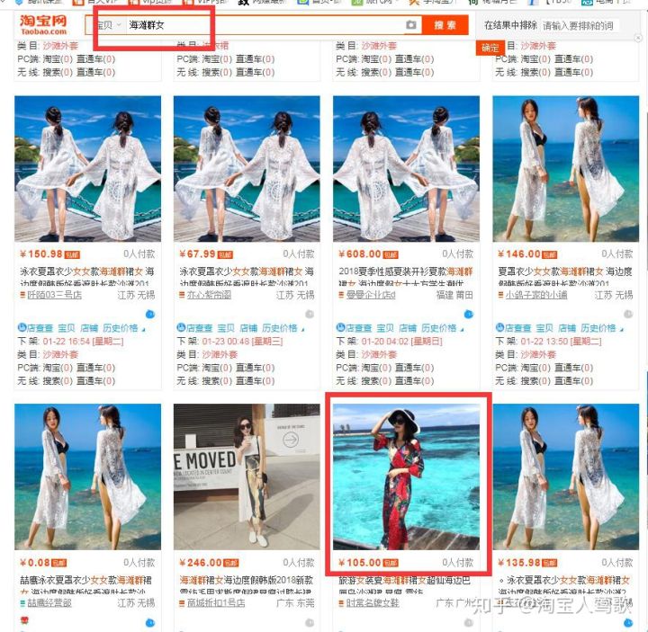 这里指的是视觉上的效果,比如,买家搜索“海滩裙女”这个关键词下可以看到,所有的产品都是白色,背景也是一样,如果这个时候,有一张主图款式颜色和背景都不一样,很明显他就能脱颖而出,只要能吸引到买家注意,点击你主图的几率就会大很多,买家在浏览宝贝的时候不会一个一个去看,有一个词叫“黄金三秒钟”,这个意思就是买家在浏览宝贝时三秒钟的时间就要引起买家的注意