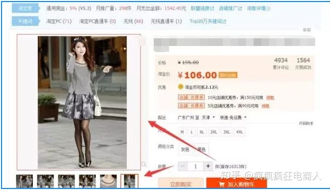 第二个、1、是我们要以什么样的形式给它展现出来,图片的点击率才会高,这又会跟刚才讲的款式有一定的关系,我们可以看到很多的一些连衣裙或者羽绒服等等像这样的一些服装类目,图片经常是两张图拼到一块的点击率比较高,