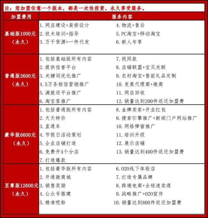 大家注意,基础版的所包含的内容1网店建设,装修设计,网店建设自己去申请一下就可以,装修设计不会?好办啊去找淘宝啊,啥玩意没有,一次性50永久帮你装修,想弄啥样就啥样。2,技术培训,简单啊。发给你俩视频自己琢磨去吧。要是用心做网店的不傻的自己点点个人店铺的相关链接,看着看着就会了。3什么万千货源。你缺货源吗?阿里巴巴啊,他们的货源在阿里巴巴都排不上号,宣传图也做的一塌糊涂。还要你自己操作上下架。麻烦至极。物流售后?阿里巴巴一键转发,客户下单供销商直接发货。什么移动淘宝啊,你开了店铺里面都有,自动就开了,可以找上面装修的帮你弄一下,总花费200块钱。 。。