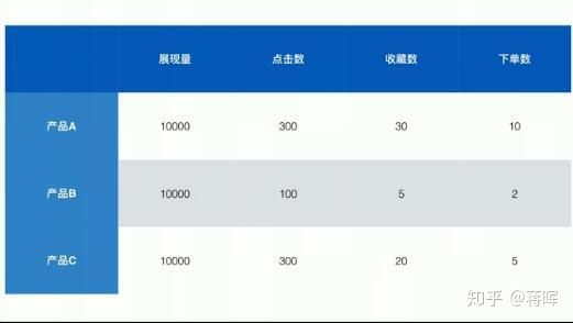用这个表格来进行数据式的演示,比如说,有ABC三款产品,产品是一样的,定价是一样的,淘宝给他们的都是10000个展示,而A和C产品都是300人点击,B产品是100人点击,那么淘宝就会判断,A和C更加的受买家的欢迎,而被点开之后呢,产品A被买家收藏了30次,下单了10次;产品C只被收藏了20次,下单了5次。