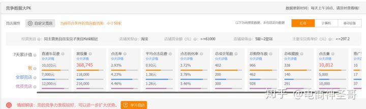 我们除了可以从流量解析中查看到主关键词的数据意外,还可以通过直通车-工具-竞争分析看到自己店铺和整个全部竞店以及优质竞店的数据作为我们的调整参考和目标,这样我们也可以得到比搜索主关键词相对全面的数据,以便我们更好的去参考,然后进行操作。