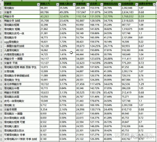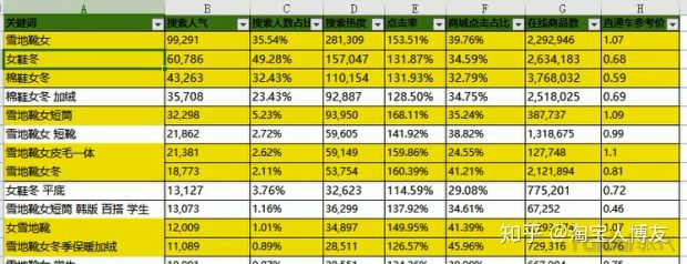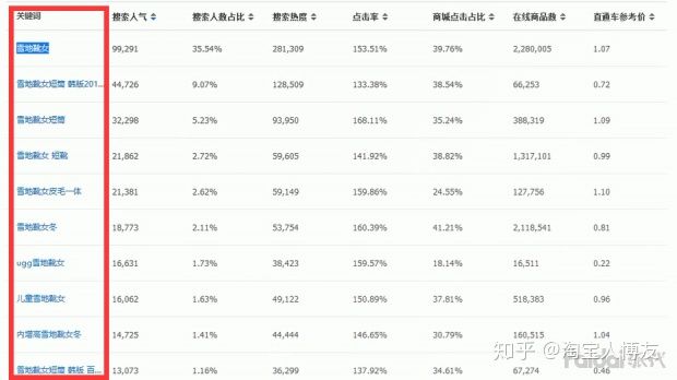 从数据情况中我们能够得知这个关键词是雪地靴女里面是搜索人气最大的。