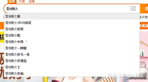 去淘宝首页的搜索框里面搜索出雪地靴女的下拉关键词。