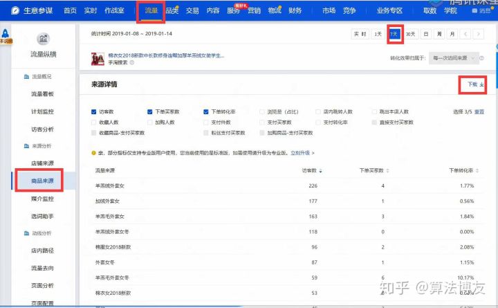 1、打开流量纵横,点击商品来源,选择7天数据, 把单品宝贝的引流关键词及数据复制在Excel表格, 删除不要的选项,保留收藏、加购、支付转化率、访客数