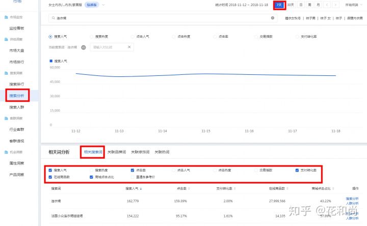 我们可以通过生意参谋-市场-搜索分析这个途径来进行我们的目标关键词筛选,找出数据好并且与我们产品相关性大的目标词。